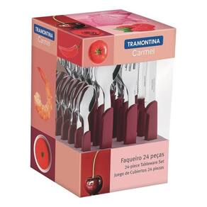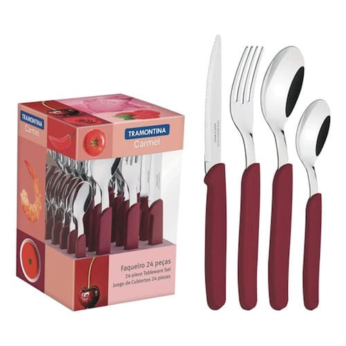 Com lâminas em aço inox e cabos de polipropileno na cor vermelho carmín escuro, o faqueiro conta com 24 peças, ele irá garantir a beleza da sua mesa, além de levar mais alegria para todas as ocasiões.