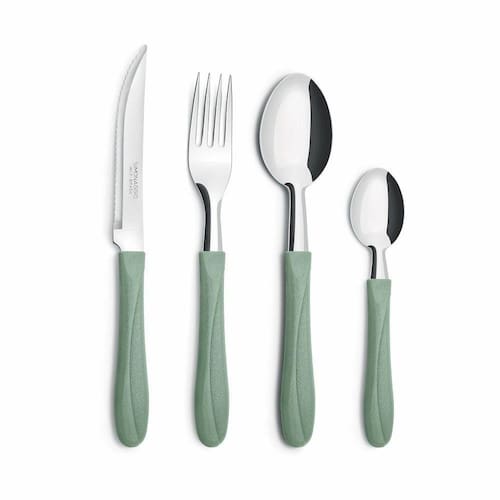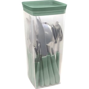 Faqueiro para 6 pessoas na cor Verde Oliva com um pote para armazenagem. Talheres com pegadores de plastico. Composto por: 6 colheres de mesa 6 garfos de mesa 6 Facas de carne (com serrilha) 6 colheres para chá ou café 1 Pote de plastico Material Aço inox e plastico Espessura: Faca com 0,8 mm garfo e colher 1,00 mm