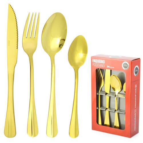 Faqueiro Conjunto Jogo Talheres Inox 24 Peças Luxo COR: DOURADO Faqueiro com 24 peças, disponível nas cores preto, cobre e dourado, essa é uma linha sofisticada com talheres confeccionados em inox de alta qualidade, possuem pintura especial que não desbota ou descasca, por sua versatilidade esse faqueiro pode ser tanto utilizado em no dia a dia como também em refeições de ocasiões especiais, ficam lindos da mesa posta.