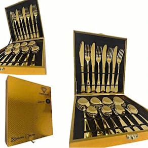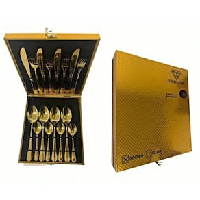 - Marca: Dusseldorf - Modelo: Golden - Cor: Dourado - Material: aço inox com banho especial em PVD - Dimensão da embalagem: 23,0cm x 26,0cm x 4,5cm A x L x P - Quantidade: 16 peças - Peso: 1,200 kg - Garantia: 3 meses