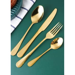 Um faqueiro dourado com 32 peças, ideal para servir até 8 pessoas. Ele possui um design robusto, com linhas retas e detalhes nas pontas dos cabos dos talheres que irá deixar a sua mesa ainda mais sofisticada. Os talheres dourados são fortes e resistentes e o revestimento é com alto padrão de qualidade e durabilidade.