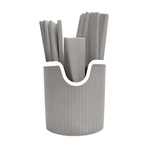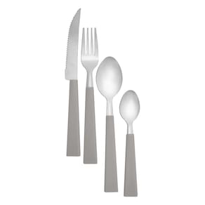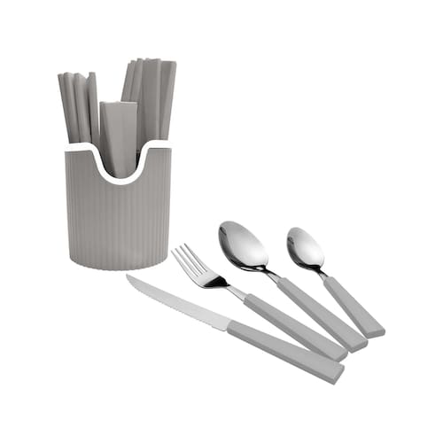 O conjunto inclui 6 garfos, 6 facas, 6 colheres de chá, 6 colheres de mesa e 1 suporte plástico, ideal para compor a mesa com organização e elegância. A cor Cinza complementa o visual.