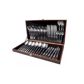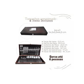 -Conteúdo da Embalagem: 01 Conjunto Maleta Faqueiro Com 06 Garfos De Mesa, 06 Facas De Mesa, 06 Colheres de Mesa, 06 Colheres De Chá, 06 Colheres De Sopa, 06 Garfos De Sobremesa, 06 Facas De Sobremesa