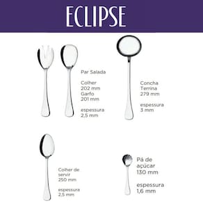 Faqueiro Hercules Aço Inox Eclipse 101 Peças Com Estojo Gift Box Descrição: A linha Hercules Eclipse eleva o requinte das suas refeições com design sofisticado e funcional. Produzido em aço inox, apresenta cabos chanfrados, pontas arredondadas e polimento entre os dentes para maior durabilidade. Perfeito para ocasiões especiais e uso diário, com estojo gift box que garante organização e apresentação premium. Os talheres Hercules seguem um rigoroso padrão de qualidade, com produtos para todas as ocasiões e necessidades, sendo reconhecida nacionalmente e internacionalmente Venha conhecer a linha completa de talheres Eclipse Hercules Características: - Aço inoxidável; - Aço Inox 18/0; - Acabamento Premium com alto Brilho; - Ergonômico; - Lamina Forjada e Temperada; - Polimento entre os dentes; - Pontas Perfurante; - Monobloco, obtidas de uma única peça, sem emendas; - Design Exclusivo e Sofisticado; - Pode ir a Lava Louças; Composição: -1 Estojo Gift Box -12 colheres de mesa: 20 cm e espessura 2,5 mm -12 garfos de mesa: 20 cm e espessura 2,5 mm -12 facas de mesa: 23 cm e espessura 7 mm -12 colheres de sobremesa: 16,5 cm e espessura 2,4 mm -12 garfos de sobremesa: 16,5 cm e espessura 2,4 mm -12 facas de sobremesa: 20 cm e espessura 6,5 mm -12 colheres de chá: 13 cm e espessura 1,8 mm -12 colheres de café: 10 cm e espessura 1,8 mm -1 colher de salada: 20 cm e espessura 2,5 mm -1 garfo de salada: 20 cm e espessura 2,5 mm -1 concha terrina: 28 cm e espessura 3 mm -1 colher para servir: 25 cm e espessura 2,5 mm -1 pá de açúcar: 13 cm e espessura 1,6 mm Especificações: Marca: Hércules; : 3 meses; ---- Aqui na Casa & Tendência você encontra os melhores utensílios domésticos e tudo que você precisa para sua cozinha ---- Marca: Não Informado