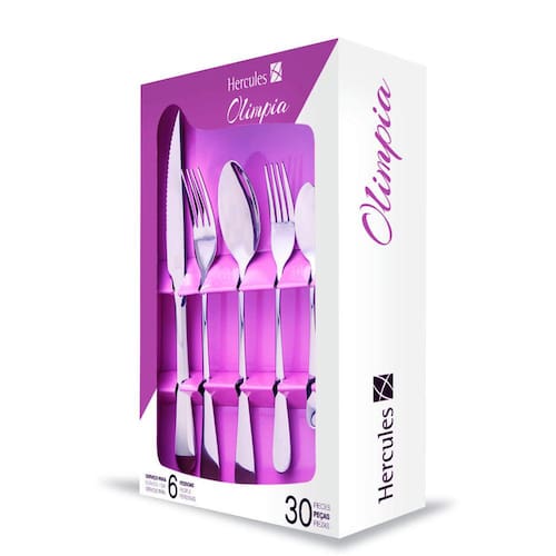 Faqueiro Olimpia da Hércules com 30 peças ideais para o dia a dia. Acabamento em alto brilho e design elegante. Cabo ergonômico. Lâmina temperada que evita de riscar os pratos e de alta durabilidade.