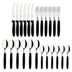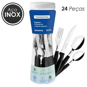 CARACTERÍSTICAS:- Com o Faqueiro Tramontina Ipanema com Lâminas em Aço Inox e Cabos de Polipropileno com Pote Plástico 24 Peças, você irá deixar suas refeições ainda mais saborosas e cheias de estilo.- O Faqueiro é produzidas com lâminas resistentes e duráveis em aço inox e cabos em polipropileno que proporcionam um manuseio confortável e suave. Ele vem na cor verde esmeralda e vai levar muito mais cor para sua mesa, deixando sua mesa muito mais agradável. Além disso, suas peças são muito fáceis de limpar e podem ir à máquina de lavar louças diariamente. O faqueiro acompanha também um pote plástico que lhe auxilia na hora de guardar e armazenar suas peças ou alimentos!- Lâminas de aço inox.- As lâminas das facas têm maior durabilidade do fio devido ao tratamento térmico.- Os garfos e colheres garantem maior resistência devido a espessura do aço e a estampagem das lâminas.- Os cabos de polipropileno possuem maior resistência e durabilidade.- Podem ir à máquina de lavar louças facilitando seu dia a dia.RECOMENDAÇÕES DE USO:- Antes da primeira utilização, lave bem as peças e seque-as.- Tenha cuidado ao manusear produtos cortantes e perfurantes e mantenha-os fora do alcance das crianças.- Para maior durabilidade dos produtos recomenda-se secar bem antes de guardar, mesmo após lavagem em máquina.- Para descarte dos produtos e embalagens siga as orientações de reciclagem vigentes.ESPECIFICAÇÕES:Dimensões dos Itens:Faca para Churrasco 5"(CxAxL): 21 x 1 x 2,2 cmPeso: 20 gGarfo de Mesa Ipanema(CxAxL): 19 x 1,6 x 2,4 cmPeso: 30 gColher de Mesa Ipanema(CxAxL): 19 x 1,7 x 4 cmPeso: 30 gColher para Chá Ipanema(CxAxL): 13,9 x 1,7 x 4 cmPeso: 30 gEmbalagem (CxAxL): 10 x 30 x 10 cmPeso: 535 gMarca: TramontinaReferência:23398291 - Verde23398491 - Goiaba23398691 - Cinza23399091 - Preto23399191 - Azul23399791 - Vermelho23399891 - BrancoCONTEÚDO DA EMBALAGEM:6 - Faca para Churrasco 5" Ipanema6 - Garfo de Mesa Ipanema6 - Colher de Mesa Ipanema6 - Colher para Chá Ipanema*IMAGENS MERAMENTES ILUSTRATIVAS*