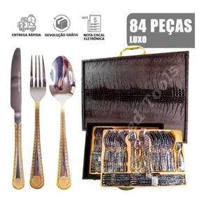 Faqueiro Inox 84 Peças Banhando Ouro 24k Faqueiro 84 peças em aço inoxidável 18/10 3.0mm de espessura com filetes banhado A ouro 24k, design exclusivoproduto novo, com garantia E nota FISCALUm bom faqueiro leva charme, elegância e bom gosto para a composição da sua mesa. Produzido em aço inox, ricamente adornado e exclusivo. Apresentam espessura de 3mm e acabamento espelhado. Maleta de armazenamento produzida em couro ecológico, com fechamento por sistema de senha. O produto POSSUI:12 Colheres12 Garfos principais12 Facas principais12 Garfos sobremesa12 Colheres sobremesa12 colheres café01 Espátula pata bolo02 Garfos peixe01 Concha grande01 Concha pequena01 Colher açucareiro01 Pegador02 Colheres para servir02 Colheres de saladaINSTRUÇÕES de abertura da maleta: - insira a senha: 0000- afaste as travas para os lados Marca: Nakazaki