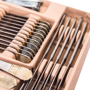 Faqueiro Inox 84 Peças Detalhe Dourado Luxo Faqueiro 84 Peças em Aço Inoxidável 18/10 3.0mm de espessura com filetes dourados, design exclusivo e sofisticado Faqueiro leva charme, elegância e bom gosto para a composição da sua mesa. Um faqueiro clássico produzido em aço inox, Ricamente adornado e exclusivo. Todas as peças são produzidas em aço inoxidável. Apresentam espessura de 3mm e acabamento espelhado. Caixa produzida em courino, estilo maleta reforçada com fechamento em sistema de código. 01 Maleta com: 12 Colheres 12 Garfos principais 12 Facas principais 12 colheres chá/sobremesa 12 Garfos sobremesa 01 Espátula pata bolo 02 Garfos peixe 01 Concha grande 01 Concha pequena 01 Colher açucareiro 01 Pegador 02 Colheres para servir 02 Colheres de salada Marca: Faqueiro