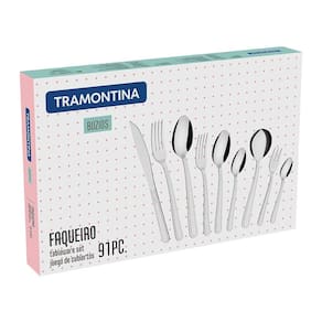 Sessão: Conjunto de Talheres<br/>Modelo: Búzios<br/>Cor: Aço Inox<br/>Peso da Embalagem:1,84 Kg<br/>Largura da Embalagem: 29,3 cm<br/>Comprimento da Embalagem: 29,6 cm<br/>Marca: Tramontina<br/> <br/>Técnica:<br/>Os talheres são produzidos em aço inox que mantém a beleza, a higiene e a durabilidade.<br/>As lâminas das facas têm maior durabilidade do fio devido ao tratamento térmico.<br/>Os garfos e colheres garantem maior resistência devido a espessura do aço e a estampagem das lâminas.<br/>Podem ir à máquina de lavar louças facilitando seu dia a dia.<br/><br/>Orientações:<br/>Antes da primeira utilização, lave bem as peças e seque-as.<br/>Tenha cuidado ao manusear produtos cortantes e perfurantes e mantenha-os fora do alcance de crianças.<br/>Para maior durabilidade dos produtos, recomenda-se secar bem antes de guardar, mesmo após lavagem em máquina.<br/>Para descarte dos produtos e embalagens siga as orientações de reciclagem vigentes.<br/> <br/>Conteúdo da Embalagem:<br/>12 Colher de Mesa Búzios <br/>12 Colher para Chá Búzios <br/>6 Colher para café <br/>12 Colher para Sobremesa Búzios <br/>12 Faca para Churrasco 4" Búzios <br/>12 Garfo de Mesa Búzios <br/>12 Garfo para Sobremesa Búzios <br/>12 Garfo para Torta Búzios <br/><br/>Dimensões:<br/>Metragem: 0,015954 m³<br/>Embalagem (C x L x A): 56 x 37 x 7,7 Cm<br/><br/>Peso:<br/>Líquido: 1,8400 Kg<br/>Bruto: 2,5900 Kg<br/><br/>Garantia: 90 dias para vícios ou defeitos de fabricação (Ofertada pelo Fabricante)<br/><br/>Fornecedor - Tramontina ; ; ; ;