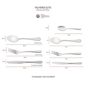 Faqueiro com talheres de mesa, salada, sobremesa e espatula em aço inoxidavel. A linha de Talheres Elite da Gourmet Mix possui design atual, com linhas arredondadas sem detalhes nos cabos, com maior espessura e acabamento em alto brilho, o que da aos talheres uma aparencia leve e sofisticada. Sao produzidos totalmente em aço inox de qualidade, garantindo a durabilidade, beleza e higiene.