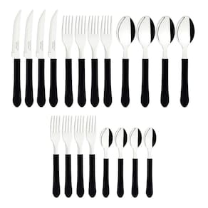Informações Gerais Lâminas de aço inox. Lâminas das facas com maior durabilidade do fio devido ao tratamento térmico. Garfos e colheres que garantem maior resistência devido a espessura do aço e a estampagem das lâminas. Cabos de polipropileno com maior resistência e durabilidade. Podem ir à máquina de lavar louças facilitando seu dia a dia.