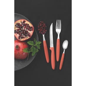 Faqueiro Tramontina Ipanema Com Lâminas Em Aço Inox E Cabos De Polipropileno Goiaba Com Pote Plástic Tramontina Faqueiro Tramontina Ipanema com Lâminas em Aço Inox e Cabos de Polipropileno Goiaba com Pote Plástico 24 Peças Tramontina - Deixe suas refeições ainda mais convidativas e alegres com o Faqueiro Tramontina Ipanema com Lâminas em Aço Inox e Cabos de Polipropileno Goiaba com Pote Plástico 24 Peças! Ele tem peças com lâminas produzidas em aço inox e cabos em polipropileno na cor goiaba, ambas características que proporcionam maior durabilidade e resistência, além de deixar sua mesa ainda mais bonita e colorida. Ele é ainda muito fácil de limpar e pode ser lavado na máquina de lavar louças, além de acompanhar um pote plástico ideal para armazenar e guardar suas peças ou alimentos!OrientaçõesLâminas de aço inox. As lâminas das facas têm maior durabilidade do fio devido ao tratamento térmico. Os garfos e colheres garantem maior resistência devido a espessura do aço e a estampagem das lâminas. Os cabos de polipropileno possuem maior resistência e durabilidade. Podem ir à máquina de lavar louças facilitando seu dia a dia.ObservaçõesAntes da primeira utilização, lave bem as peças e seque-as. Tenha cuidado ao manusear produtos cortantes e perfurantes e mantenha-os fora do alcance das crianças. Para maior durabilidade dos produtos recomenda-se secar bem antes de guardar, mesmo após lavagem em máquina. Para descarte dos produtos e embalagens siga as orientações de reciclagem vigentes.Características GeraisEAN137891112282841DUN1417891112282848NCM8215.20.00Peso Líquido0,5350 kg.Peso Bruto0,6250 kg.Metragem0,003000 m.Dimensões Embalagem (Compr. X Larg. X Alt.)100x 100x 300 mm.Cor 1C26E60 Hexa Características Gerais do Produto: Garantia: - 1 Ano
