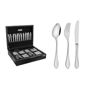 Seu design único e acabamento em alto brilho trazem uma sofisticação exclusiva para a mesa, garantindo um serviço completo para mesa e sobremesa. O jogo conta com colheres com bojo em formato simétrico e bordas cuidadosamente arredondadas. Garfos com dentes polidos na parte interna, com formato apropriado para a boca e bordas arredondadas para proporcionar maior conforto no uso. Facas com lâminas temperadas, que garante maior durabilidade no fio de corte serrilhado e maior resistência à corrosão, e por sua característica de temperabilidade, não riscam as porcelanas. As peças são produzidas em aço inox, proporcionando uma durabilidade única. O faqueiro conta com um belo estojo de madeira MDF com compartimento retrátil, que pode ser utilizado na decoração de forma elegante.