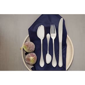 Contém: 12 facas de sobremesa, 12 garfos para sobremesa, 12 colheres para sobremesa, 12 colheres de chá, 12 colheres para café, 12 facas de mesa, 12 colheres de mesa, 12 garfos de mesa, 1 colher para arroz, 1 concha para terrina, 1 colher para açúcar, 1 colher para salada e 1 garfo para salada.