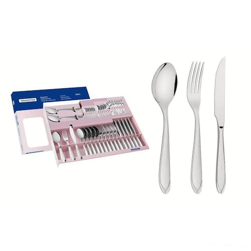 Peças totalmente feitas de aço inox, altamente duráveis, mantêm suas características , preservando a beleza, a higiene e a durabilidade do material. Colheres com bojo em formato simétrico e bordas cuidadosamente arredondadas. Garfos com dentes polidos na parte interna, com formato apropriado para a boca e bordas arredondadas para proporcionar maior conforto no . Facas totalmente temperadas, que garantem maior durabilidade no fio de corte e maior resistência à corrosão, e por suas características de temperabilidade, não riscam as porcelanas. Acabamento em brilho, com detalhes no cabo. Próprias para diário combinam com qualquer ambiente. Podem ser lavadas diariamente na máquina de lavar louças.