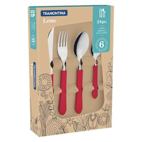 Deixe suas refeições cheias de estilo e muito mais deliciosas com o Faqueiro Tramontina Leme com Lâminas em Aço Inox e Cabos de Polipropileno Vermelho 24 Peças Ele possui peças produzidas com lâminas resistentes e duráveis em aço inox e com cabos de polipropileno que proporcionam um manuseio super confortável, o faqueiro leva muito mais estilo e originalidade a sua mesa. Ele também é muito fácil de limpar e pode ser levado à máquina de lavar louças. A escolha perfeita para cozinha Contém: 6 Facas para Churrasco 4 6 Garfos de Mesa 6 Colheres de Mesa 6 Colheres para Chá Importante: Lâminas de aço inox. As lâminas das facas têm maior durabilidade do fio devido ao tratamento térmico. Os garfos e colheres garantem maior resistência devido a espessura do aço e a estampagem das lâminas. Os cabos de polipropileno possuem maior resistência e durabilidade. Podem ir à máquina de lavar louças facilitando seu dia a dia. Tenha cuidado ao manusear produtos cortantes e perfurantes e mantenha-os fora do alcance das crianças. Para maior durabilidade dos produtos recomenda-se secar bem antes de guardar, mesmo após lavagem em máquina.