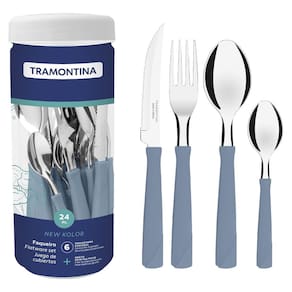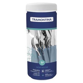 Garanta praticidade e estilo às suas refeições com o Faqueiro New Kolor Tramontina Azul com 24 Peças com lâminas em aço inox e cabos de polipropileno azul.