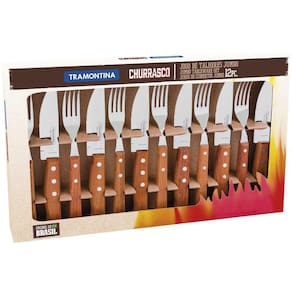 Jogo De Talheres Para Churrasco Aço Inox Tramontina Jumbo 12 Peças 22399/063 Conteúdo: 06 Facas Para Churrasco Jumbo 5 06 Garfos Para Churrasco Jumbo Descrição: Desenvolvidos para estarem presentes desde as refeições mais simples até as mais especiais, o Jogo de Talheres para Churrasco Tramontina possui belas peças com cabo de madeira natural, que leva mais beleza e rusticidade para sua mesa, além da resistência a impactos e altas temperaturas, talheres com maior espessura e estampagem do aço que evita deformações. Além do mais, as peças podem ir à máquina de lavar louças. 1. Facas: lâmina com maior durabilidade do fio devido ao tratamento térmico. 2. Garfos: a espessura do aço e a estampagem das lâminas garantem maior resistência aos produtos. 3. Cabos rústicos e naturais. 4. Permanecem bonitos por muito mais tempo. Tenha cuidado ao manusear produtos cortantes e perfurantes e mantenhaos fora do alcance das crianças. Para maior durabilidade dos produtos recomendase secar bem antes de guardar. EAN13: 7891112214873 DUN14: 17891112214870 NCM: 8215.20.00 Peso Líquido: 0,7710 kg. Peso Bruto: 1,0820 kg. Metragem: 0,004806 m³. Dimensões Embalagem (Compr. X Larg. X Alt.): 445x 270x 40 mm.