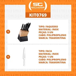 OBS: Veja na descrição os itens que acompanham o jogo. COMPONENTES DO KIT: 1 - Jogo de 6 PÇ 4 facas, 1 garfo e Suporte de Madeira Plenus - Tramontina 23498028 1 - Faca para Carne Profissional 6 Polegadas Cabo Branco - Tramontina 24619086 Jogo de 6 PÇ 5 pç e Suporte de Madeira Plenus Lâminas Inox Cabos Polipropileno - Tramontina 23498028 - Cor do cabo: Preto - Material do cabo: Polipropileno - Peso Líquido: 1,1 kg. - Peso Bruto: 1,3 kg. - Dimensões Produto: 30cm A x 12cm L x 21cm C. - Dimensões Embalagem 31cm A x 13cm L x 22cm C. - Conteúdo do jogo: 1 - 29900500 - Base de Madeira 1 - 23426007 - Faca Chef Lâmina 7 17,78cm 1 - 23425005 - Faca Desossar Lâmina 5 12,7cm 1 - 23420003 - Faca para Legumes e FrutasLâmina 3 7,62cm 1 - 23428005 - Faca para Tomates Lâmina 5 12,7cm 1 - 23432000 - Garfo Trinchante Faca para Carne Profissional 6 Polegadas Cabo Branco - Tramontina 24619086 : Contra defeitos de fabricação - CERTIFICAÇÃO NSF: Os produtos da linha Profissional Master são certificadas pela National Sanitation Foundation NSF , organização reconhecida como a autoridade internacional em segurança alimentar e práticas de higiene. - Lâmina de aço inox DIN 1.4110. - Cor do cabo: Branco - Material do cabo: Polipropileno - Peso Líquido: 0,0750 kg. - Peso Bruto: 0,0790 kg. - Dimensões Produto: 1,5cm A x 3,4cm L x 27,5cm C. - Dimensões Embalagem 1,6cm A x 3,6cm L x 29,0cm C. Marca: Não Informado