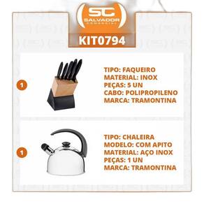 OBS: Veja na descrição os itens que acompanham o jogo.COMPONENTES DO KIT:1 - Jogo de 6 PÇ 4 facas, 1 garfo e Suporte de Madeira Plenus - Tramontina 234980281 - Chaleira em aço inox com Apito capacidade 2,1 Lts - Tramontina 61483013Jogo de 6 PÇ 5 pç e Suporte de Madeira Plenus Lâminas Inox Cabos Polipropileno - Tramontina 23498028- Cor do cabo: Preto- Material do cabo: Polipropileno- Peso Líquido: 1,1 kg.- Peso Bruto: 1,3 kg.- Dimensões Produto: 30cm A x 12cm L x 21cm C.- Dimensões Embalagem 31cm A x 13cm L x 22cm C.- Conteúdo do jogo:1 - 29900500 - Base de Madeira1 - 23426007 - Faca Chef Lâmina 7 17,78cm 1 - 23425005 - Faca Desossar Lâmina 5 12,7cm 1 - 23420003 - Faca para Legumes e FrutasLâmina 3 7,62cm 1 - 23428005 - Faca para Tomates Lâmina 5 12,7cm 1 - 23432000 - Garfo TrinchanteChaleira em aço inox com Apito capacidade 2,1 Lts - Tramontina 61483013Garantia: 90 dias para vícios ou defeitos de fabricação.Produto com certificação compulsória certificada pela OCP 0003, registro 001226/2018, modelo linha Chá e Café, conforme portaria INMETRO 419/2012.- Feita de aço inox, por isso não solta nenhum resíduo nos alimentos, mantendo-os saudáveis.- Altamente durável, mantém as características , preservando a beleza, a higiene e a durabilidade do material.- Acabamento em alto brilho, valorizando o produto.- Para uso doméstico.- Com apito, avisa na hora em que a água estiver fervendo; o sistema de apito é acionado por meio do vapor no momento em que a água inicia a fervura na chaleira.- Possui cabo de material especial, que não deixa o calor passar.- Tampa com encaixe especial, que não deixa vazar e cair na hora de servir.- Pode ser utilizada nos fogões: gás, elétrico e vitrocerâmico.- Diâmetro: 19,0 cm.- Capacidade: 2,10 Lts.- Peso Líquido: 0,80 kg.- Peso Bruto: 0,95 kg.- Medidas Produto: 21,8cm A x 19cm L x 22,8cm C- Medidas Embalagem: 22,7cm A x 19,2cm L x 19,2cm C