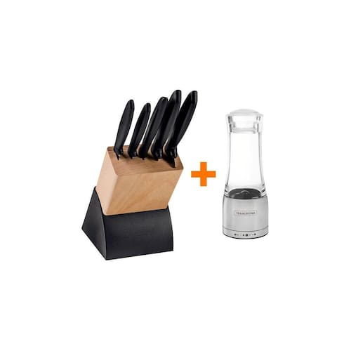 OBS: Veja na descrição os itens que acompanham o jogo. COMPONENTES DO KIT: 1 - Jogo de 6 PÇ 4 facas, 1 garfo e Suporte de Madeira Plenus - Tramontina 23498028 1 - Moedor Saleiro Sal ou Pimenta Realce em Acrílico e Inox com Moinho em Cerâmica - Tramontina 61653000 Jogo de 6 PÇ 5 pç e Suporte de Madeira Plenus Lâminas Inox Cabos Polipropileno - Tramontina 23498028 - Cor do cabo: Preto - Material do cabo: Polipropileno - Peso Líquido: 1,1 kg. - Peso Bruto: 1,3 kg. - Dimensões Produto: 30cm A x 12cm L x 21cm C. - Dimensões Embalagem 31cm A x 13cm L x 22cm C. - Conteúdo do jogo: 1 - 29900500 - Base de Madeira 1 - 23426007 - Faca Chef Lâmina 7 17,78cm 1 - 23425005 - Faca Desossar Lâmina 5 12,7cm 1 - 23420003 - Faca para Legumes e FrutasLâmina 3 7,62cm 1 - 23428005 - Faca para Tomates Lâmina 5 12,7cm 1 - 23432000 - Garfo Trinchante Moedor Saleiro Sal ou Pimenta Realce em Acrílico e Inox com Moinho em Cerâmica - Tramontina 61653000 : 90 dias para vícios ou defeitos de fabricação. - Prático e elegante - Possui engrenagens de alta resistência, proporcionando maior durabilidade - Com ajuste de moagem, possui regulador de tamanho de grão, para que seja ajustado conforme seu gosto - Garantindo higiene e beleza - Material: acrílico + aço inox - Moedores de cerâmica - Compartimento de acrílico - Tampa de acrílico - Capacidade: - Sal = 150 G - Pimenta = 75 G - EAN13: 7891116110829 - DUN14: 17891116110826 - NCM: 8210.00.10 - Peso Líquido: 0,2090 kg. - Peso Bruto: 0,2750 kg. - Medidas Produto: 16,7cm A x 6,5cm diâmetro - Medidas Embalagem: 18,5cm A x 7,4cm L x 7,4cm C Marca: Não Informado