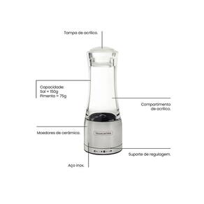 OBS: Veja na descrição os itens que acompanham o jogo. COMPONENTES DO KIT: 1 - Jogo de Faca Premium 3 PÇ - Tramontina 24499811 1 - Moedor Saleiro Sal ou Pimenta Realce em Acrílico e Inox com Moinho em Cerâmica - Tramontina 61653000 Jogo de Facas Premium com Lâminas em Aço Inox e Cabos de Polipropileno Branco 3 Peças - Tramontina 24499811 : 90 dias para vícios ou defeitos de fabricação. As lâminas de aço inox tem maior durabilidade do fio devido ao tratamento térmico. Os cabos de polipropileno possuem maior resistência e durabilidade. Podem ir à máquina de lavar louças facilitando seu dia a dia. - Cor do cabo: Branco - Material do cabo: Polipropileno - Peso Líquido: 0,20 kg. - Peso Bruto: 0,25 kg. - Medidas Embalagem: 2,0cm A x 16cm L x 38cm C - Conteúdo do jogo: 1 - 24472186 - Faca Utility Lâmina 6 15,24cm 1 - 24473187 - Faca para Cozinha lâmina 7 17,78cm 1 - 24470184 - Faca para Frutas e Legumes Lâmina 4 10,16cm Moedor Saleiro Sal ou Pimenta Realce em Acrílico e Inox com Moinho em Cerâmica - Tramontina 61653000 : 90 dias para vícios ou defeitos de fabricação. - Prático e elegante - Possui engrenagens de alta resistência, proporcionando maior durabilidade - Com ajuste de moagem, possui regulador de tamanho de grão, para que seja ajustado conforme seu gosto - Garantindo higiene e beleza - Material: acrílico + aço inox - Moedores de cerâmica - Compartimento de acrílico - Tampa de acrílico - Capacidade: - Sal = 150 G - Pimenta = 75 G - Peso Líquido: 0,2090 kg. - Peso Bruto: 0,2750 kg. - Medidas Produto: 16,7cm A x 6,5cm diâmetro - Medidas Embalagem: 18,5cm A x 7,4cm L x 7,4cm C Marca: Não Informado