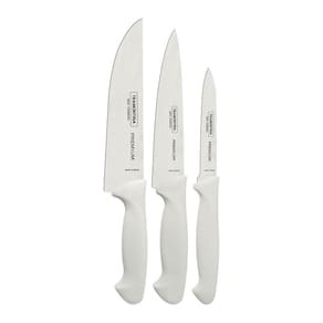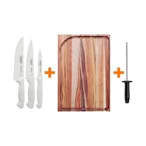 OBS: Veja na descrição os itens que acompanham o jogo. COMPONENTES DO KIT: 1 - Jogo de Faca Premium 3 PÇ - Tramontina 24499811 1 - Tábua de Cortar e Servir carne Churrasco Retangular 35x49 em Madeira - Tramontina 13474051 1 - Chaira Estriada Afiador Faca Ultracorte com Haste em Aço Carbono 8 Tramontina 246411108 Jogo de Facas Premium com Lâminas em Aço Inox e Cabos de Polipropileno Branco 3 Peças - Tramontina 24499811 : 90 dias para vícios ou defeitos de fabricação. As lâminas de aço inox tem maior durabilidade do fio devido ao tratamento térmico. Os cabos de polipropileno possuem maior resistência e durabilidade. Podem ir à máquina de lavar louças facilitando seu dia a dia. - Cor do cabo: Branco - Material do cabo: Polipropileno - Peso Líquido: 0,20 kg. - Peso Bruto: 0,25 kg. - Medidas Embalagem: 2,0cm A x 16cm L x 38cm C - Conteúdo do jogo: 1 - 24472186 - Faca Utility Lâmina 6 15,24cm 1 - 24473187 - Faca para Cozinha lâmina 7 17,78cm 1 - 24470184 - Faca para Frutas e Legumes Lâmina 4 10,16cm Tábua de Cortar e Servir carne Churrasco Retangular 35x49 em Madeira - Tramontina 13474051 Mais do que um prato típico brasileiro e, principalmente, gaúcho, o churrasco é uma tradição, e a tradição diz que a carne, depois de assada, deve ser picada em uma tábua de madeira. Para preservar A tradição e garantir a qualidade do seu assado, a Tramontina desenvolveu a Tábua para Churrasco Retangular Grande em Madeira Teca com acabamento em Óleo Vegetal, 35cm x 49cm. - Peso Líquido: 1,9 kg. - Peso Bruto: 2,0 kg. - Dimensões Produto: 2,0cm A x 35cm L x 49cm C. - Dimensões Embalagem 2,3cm A x 36cm L x 50cm C. Chaira Estriada Afiador Faca Ultracorte com Haste em Aço Carbono 8 Tramontina 246411108 Haste em aço carbono revestida com cromo-duro. O cabo de polipropileno possui maior resistência e durabilidade. E conta com proteção antimicrobiana, que inibe e reduz o crescimento de bactérias e fungos proporcionando benefícios em higiene e Redução de microrganismos que causam contaminação. Esta ação dura por toda a vida útil dos produtos, mas não elimina a necessidade de limpeza. Pode ir à máquina de lavar louças facilitando seu dia a dia. - Cor do cabo: Preto - Material do cabo: Polipropileno - Peso Líquido: 0,18 kg. - Peso Bruto: 0,21 kg. - Medida Produto: 3,6cm A x 6,0cm L x 32cm C. - Medidas Embalagem: 3,8cm A x 7,5cm L x 40cm C.