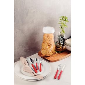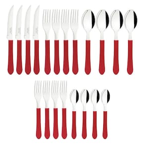 Tipo de embalagem: Pote | Material do cabo: Plástico | Modelo detalhado: Leme | Marca: Tramontina | Modelo: Leme | Material da lâmina: Aço Inox | Fonte do produto: Tramontina | Linha: Leme | Condição do item: Novo | Talheres incluídos: Garfo, Faca, Colher e Colher de Chá | É kit: Não | Cor: Inox | Unidades por kit: 20 Cor: Vermelho