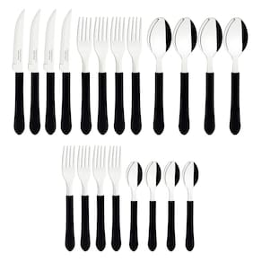 Contém: 8 facas para churrasco,8 garfos de mesa,8 colheres de mesa,8 garfos de sobremesa e8 colheres para chá