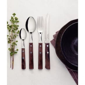 Faqueiro Tramontina Aço Inox Polywood Castanho 24 Peças Talheres de qualidade deixam sua mesa muito mais convidativa. Um exemplo é a linha Polywood Castanho que, com seus cabos de madeira tratada, faz bonito em encontros mais informais. Recomendações de Uso: Antes do uso: Antes de utilizar o , remova as eventuais etiquetas e lave-o com água e de uso: Durante a lavagem use somente esponja macia, outros tipos de produtos, como palha de aço, poderão riscar ou prejudicar o brilho do aço inox. Enxágue bem a peça a fim de remover totalmente os resíduos dos produtos de limpeza, que por serem abrasivos, podem danificar o inox. Após a lavagem enxugue a peça, pois as substâncias químicas contidas na água poderão causar manchas. Sempre que possível use água quente, pois renova o brilho do talher. Evite o das peças com superfícies quentes, pois podem provocar a descoloração do produto. Quando usar a máquina de lavar louça, recomendamos retirar o talher logo que tenha terminado o ciclo enxaguar, a fim de que os mesmos sejam secados manualmente.- Foto meramente ilustrativa. Informações Adicionais: