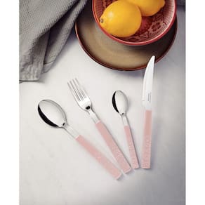 Lâminas de aço inox. Lâminas das facas com maior durabilidade do fio devido ao tratamento térmico. Garfos e colheres garantem maior resistência devido a espessura do aço e a estampagem das lâminas. Cabos de polipropileno com uma estampa moderna.