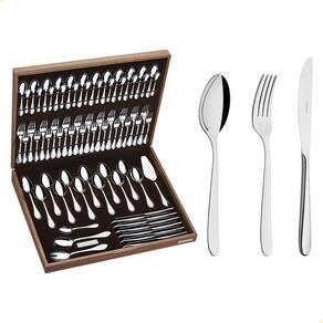 Faqueiro Tramontina Cannes em Aço Inox com Facas de Mesa Forjadas Acabamento Alto Brilho e Estojo de Madeira 76 Peças 66979300