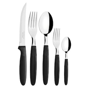 Se você gosta de ter talheres bonitos e clássicos para acompanhar as suas refeições, o Faqueiro Tramontina Ipanema com Lâminas em Aço Inox e Cabos de Polipropileno Preto com Pote Plástico 30 Peças é a escolha perfeita. As peças dão aquele toque charmoso a sua cozinha e deixam o jantar mais atraente, pois possuem cabos de polipropileno na estilosa cor preta. As lâminas são produzidas em aço inox e oferecem maior durabilidade ao fio devido ao tratamento térmico a que são submetidas. É um faqueiro super prático, pois pode ir à máquina de lavar louças e conta com um pote plástico que pode ser utilizado tanto para armazenar os talheres quanto para organizar sua cozinha. Sua mesa fica muito mais completa com a Tramontina! Orientações Lâminas de aço inox. As lâminas das facas têm maior durabilidade do fio devido ao tratamento térmico. Os garfos e colheres garantem maior resistência devido a espessura do aço e a estampagem das lâminas. Os cabos de polipropileno possuem maior resistência e durabilidade. Podem ir à máquina de lavar louças facilitando seu dia a dia. Observações Antes da primeira utilização, lave bem as peças e seque-as.Tenha cuidado ao manusear produtos cortantes e perfurantes e mantenha-os fora do alcance das crianças.Para maior durabilidade dos produtos recomenda-se secar bem antes de guardar, mesmo após lavagem em máquina. Para descarte dos produtos e embalagens siga as orientações de reciclagem vigentes. Características Gerais EAN13 7891112274082 DUN14 17891112274089 NCM 8215.20.00 Peso Líquido 0,6300 kg. Peso Bruto 0,7250 kg. Metragem 0,002964 m³. Dimensões Embalagem (Compr. X Larg. X Alt.) 104x 104x 274 mm. Cor 1 000000 Hexa