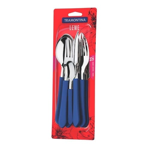 Características do produto: Sessão: Faqueiro Modelo: Leme Cor: Azul Quantidade de Peças: 12 Peças Marca: Tramotina Uso Adequado e Seguro: Antes da primeira utilização, lave bem as peças e seque-as. Tenha cuidado ao manusear produtos cortantes e perfurantes e mantenha-os fora do alcance de crianças. Para maior durabilidade dos produtos, recomenda-se secar bem antes de guardar, mesmo após lavagem em máquina. Para descarte dos produtos e embalagens siga as orientações de reciclagem vigentes. Composição do Jogo: 3 Colheres de Mesa Leme 3 Colheres para Chá Leme 3 Facas para Churrasco 4¿ 3 Garfos de Mesa Leme Dimensões: