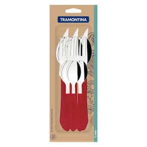 Se você gosta de deixar sua mesa colorida e atrativa, o Faqueiro Tramontina Leme com Lâminas em Aço Inox e Cabos de Polipropileno Vermelho 12 Peças é indispensável. Perfeitas para uso diário, suas peças são resistentes e duráveis, devido às lâminas produzidas em aço inox e aos cabos de polipropileno. As facas possuem aplicação de tratamento térmico para deixar o fio de corte excelente e os garfos e facas tem espessura e estampagem especial. Todos eles ainda são fáceis de limpar, podem ir à máquina de lavar louças e vão facilitar sua rotina na cozinha. Escolha Tramontina e deixe sua mesa muito mais bonita! Orientações Lâminas de aço inox. As lâminas das facas têm maior durabilidade do fio devido ao tratamento térmico. Os garfos e colheres garantem maior resistência devido a espessura do aço e a estampagem das lâminas. Os cabos de polipropileno possuem maior resistência e durabilidade. Podem ir à máquina de lavar louças facilitando seu dia a dia. Características Gerais EAN13 7891112200265 DUN14 17891112200262 NCM 8215.20.00 Peso Líquido 0,2200 kg. Peso Bruto 0,2400 kg. Metragem 0,001100 m³. Dimensões Embalagem (Compr. X Larg. X Alt.) 40x 100x 275 mm. Cor 1 A6192E Hexa Observações Antes da primeira utilização, lave bem as peças e seque-as.Tenha cuidado ao manusear produtos cortantes e perfurantes e mantenha-os fora do alcance das crianças.Para maior durabilidade dos produtos recomenda-se secar bem antes de guardar, mesmo após lavagem em máquina. Para descarte dos produtos e embalagens siga as orientações de reciclagem vigentes.
