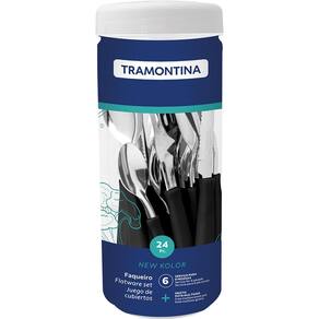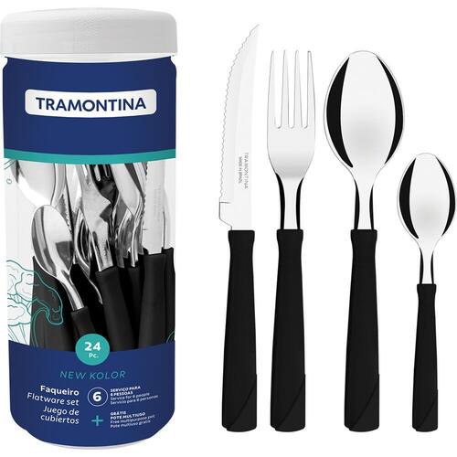 Com o Faqueiro Tramontina New Kolor, 24 Pecas, Preto - 23198/093 voce garante praticidade e estilo as suas refeicoes. Com design funcional e moderno, oferece garfos, colheres e facas de alta qualidade. As laminas em aco inox garantem durabilidade e resistencia a corrosao, enquanto as facas possuem laminas temperadas, proporcionando excelente desempenho no corte. Os cabos de polipropileno sao ergonomicos e confortaveis, permitindo um manuseio seguro e preciso. Alem disso, as pecas sao faceis de limpar e podem ser levadas a lava-loucas, tornando suas refeicoes ainda mais praticas e elegantes. Nao perca essa oportunidade e garanta ja o seu!