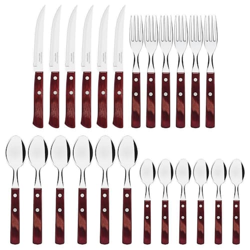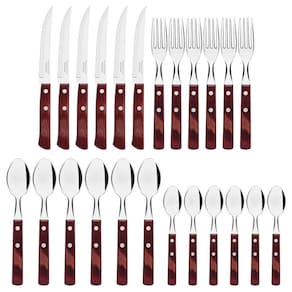 Lâminas de aço inox. As lâminas das facas têm maior durabilidade do fio devido ao tratamento térmico. As lâminas dos garfos e colheres contam com maior espessura e uma estampagem do aço que garante maior resistência, evitando deformações. Os cabos de madeira tratada Polywood são resistentes à impactos e alta temperaturas garantindo maior resistência e durabilidade. Rebites de alumínio. Podem ir à máquina de lavar louças facilitando seu dia a dia.