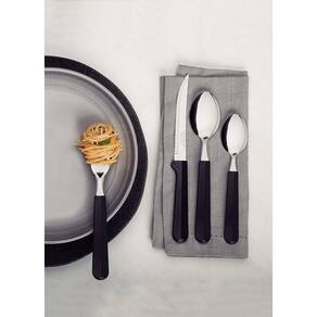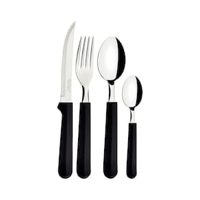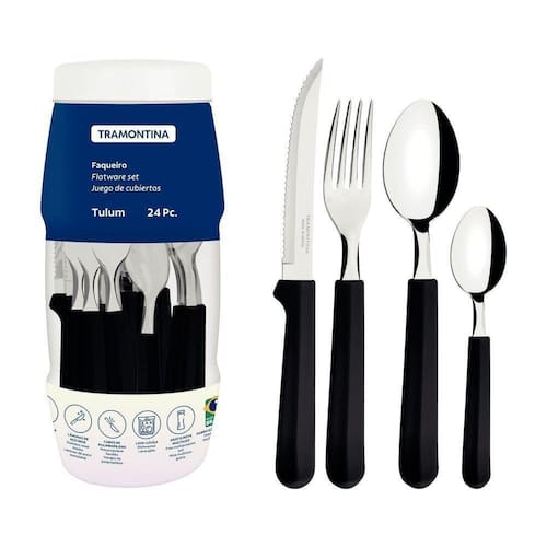 O faqueiro Tramontina Tulum com lâminas em aço inox e cabos de polipropileno preto 24 peças é um coringa para a composição da sua mesa e irá compor bem com qualquer estilo de louça. Todas as peças são desenvolvidas com lâminas em aço inox com cabos de polipropileno. As facas tem tratamento térmico e garantem alta durabilidade no fio de corte e os garfos e colheres contam com estampagem e espessura, fazendo que sejam resistentes e duráveis. Os cabos são em polipropileno na cor preta, garantem modernidade para sua mesa e podem ir à máquina de lavar louças, facilitando seu dia a dia na cozinha!