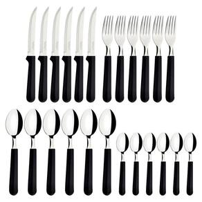 Lâminas de aço inox. Lâminas das facas com maior durabilidade do fio devido ao tratamento térmico. Garfos e colheres que garantem maior resistência devido a espessura do aço e a estampagem das lâminas. Os cabos de polipropileno possuem maior resistência e durabilidade. Podem ir à máquina de lavar louças facilitando seu dia a dia.