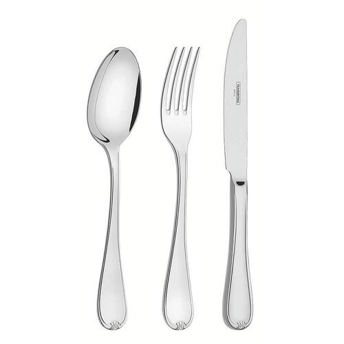 DESCRIÇÃO - Garfos com dentes polidos na parte interna, com formato apropriado para a boca e bordas arredondadas para proporcionar maior conforto no uso. - Facas com lâminas temperadas, que garante maior durabilidade no fio de corte serrilhado e maior resistência à corrosão, e por sua característica de temperabilidade, não riscam as porcelanas. - As peças são produzidas em aço inox, garantindo durabilidade e o alto brilho do material. - Pode ser utilizado em serviço de mesa e sobremesa.