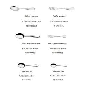 CONTEÚDO DO JOGO: 12 Colher de mesa 1 Colher para arroz 12 Colher para café 12 Colher para chá 12 Colher para sobremesa 1 Concha terrina 12 Faca de mesa forjada 12 Faca para sobremesa forjada 12 Garfo de mesa 12 Garfo para sobremesa 1 Pá para açúcar 2 Talheres para salada