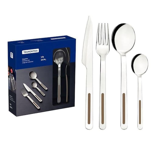 Com o faqueiro Tramontina Vik em aço inox com detalhes em polipropileno ágata 24 peças você tem uma excelente opção para transformar sua mesa e deixá-la encantadora para suas refeições. Produzidas em aço inox com acabamento polido fosco, suas peças tem um design minimalista e contam com detalhes no cabo em polipropileno na cor ágata, onde na parte frontal o metal fica exposto e no verso fica aparente o detalhe. As facas proporcionan um fio com maior durabilidade e os garfos e colheres tem estampagem e espessura especial que garantem maior resistência. Para maior praticidade no seu dia a dia, o faqueiro ainda pode ser levado à máquina de lavar louças. Tramontina, prazer em fazer bonito!