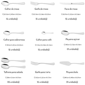 CONTEÚDO DO JOGO - 12 Colher de Mesa Zurique em Aço Inox - 12 Garfo de Mesa Zurique em Aço Inox - 12 Faca de Mesa Zurique em Aço Inox - 12 Colher para Sobremesa Zurique em Aço Inox - 12 Colher para Café Zurique em Aço Inox - 1 Colher para Açúcar Zurique em Aço Inox - 2 Talheres para Salada Zurique em Aço Inox - 12 Garfo para Torta Zurique em Aço Inox - 1 Pá para Bolo Zurique em Aço Inox
