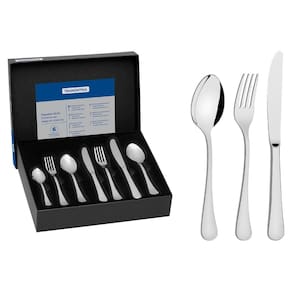 O conjunto conta com colheres com bojo em formato simétrico e bordas cuidadosamente arredondadas. Garfos com dentes polidos na parte interna, com formato apropriado para a boca e bordas arredondadas para proporcionar maior conforto no uso.
