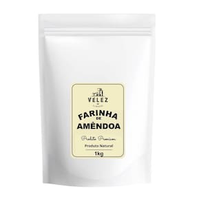A embalagem contém 1kg de farinha de amêndoas Velez, garantindo quantidade suficiente para diversas receitas e momentos de refeição saudável.