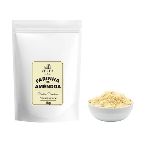 A embalagem contém 1kg de farinha de amêndoas Velez, garantindo quantidade suficiente para diversas receitas e momentos de refeição saudável.