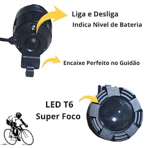 Kit Carregador Multifuncional de Farol de bicicleta Cl-8035 Farol Bike Led T6 Lanterna Cabeça com Lanterna Traseira + 6 BateriasChega uma das lanternas mais potentes do mundo com uma autonomia impressionante Agora ao alcance da suas mãos e do seu bolso Maior luminosidade o LED T6 e o Led. Aquele mesmo Led que seu foco pode atingir mais de 800 metros de distância. Excelente para viagens, caminhadas noturnas, trilhas, pedaladas ou tudo que se necessita de uma iluminação limpa, clara e satisfatória. Ela Possui 3 modos de intensidade, sendo forte, fraco e strobo, sendo resistente a quedas e a água. Especificações:- Possui Caixa para guardar todo o kit- Lanterna Bike / Cabeça com Botão para 3 Funções Luminosas: Luz Fraca Luz Forte Strobo- Resistente a água Pode ser em chuva intensa - Bateria agora com 6 Baterias unificadas de maior capacidade- Longo Alcance sem perder a potência e foco- Possui Carregador Veicular- Fonte Bivolt Automática- Dois Modos de Utilização, como farol de bike ou lanterna de cabeçaItens Inclusos:- 01 Lanterna Farol T6- 01 Lanterna Traseira com 5 Leds Pilhas não inclusas - 01 Embalagem com 6 baterias recarregáveis- 01 Carregador de tomada Bivolt 110-220 V - 01 Carregador Veicular 12V- 01 Suporte para o guidão da Bike- 01 Bolsa pra guardar a bateria e fixar no quadro- 01 Cinta com presilha pra acoplar o Farol na Cabeça Marca: Não Informado Ean: 7895186172138