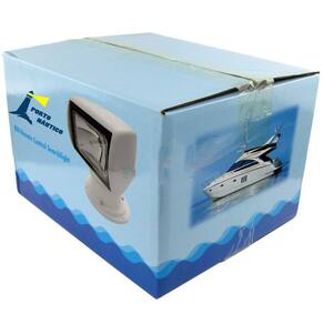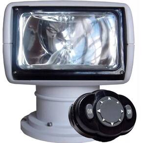 Farol selado com lâmpada Halogena, com 100 watts, 12 volts, potência de 350.000 velas, 3000 lumens, capa externa em termoplástico resistente à corrosão, acompanha 5 metros de cabo e controle total acionado por botões, movimenta-se a 360º na horizontal. Alcance de 150m.