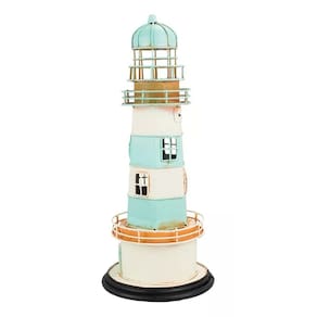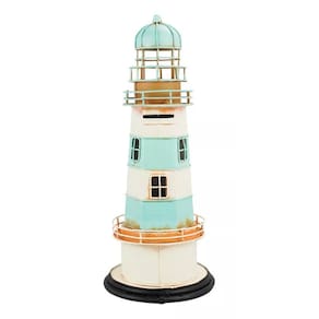 Enfeite decorativo em forma de um farol com detalhes em azul com 31,5 x 13 x 13 cm de dimensão, detalhes e cores muito realista. Este item também funciona como cofre porta moeda. Material: metal; Atenção: este produto tem apenas função decorativa, não é um brinquedo e nem um farol de verdade!