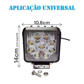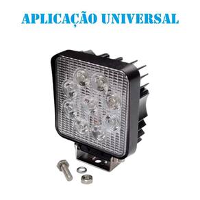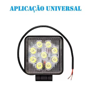 Potência: 27w; Vida útil estimada em 30.000+ horas; Temperatura de operação: -40c à 85c; Carcaça em alumínio, que garante a dissipação do calor do led; Lente tipo flood maior abertura ; Ip67 totalmente resistente contra poeira e altamente resistente contra água ; Alimentação: 10v - 30v; Suporte de fixação em inox; Instalação universal em qualquer máquina ou veículo; Suporte articulável, com 180 de ajuste.